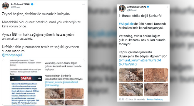 Tanal ise Beyazgül’ün bu çıkışına geçtiğimiz Ocak ayında gündeme gelen ve kanalizasyonu olmadığı iddia edilen Akçakale Donandı mahallesi örneğini hatırlattı. “Zeynel başkan, sivrisinekle mücadele kolaydır” diyen Tanal, şu ifadelere yer verdi: Müsebbibi olduğunuz bataklığı nasıl yok edeceğinize kafa yorun önce. Ayrıca İBB'nin halk sağlığına yönelik hassasiyetini anlamaktan acizsiniz. Urfalılar sizin yüzünüzden temiz ve sağlıklı çevreden, sudan mahrum.”
