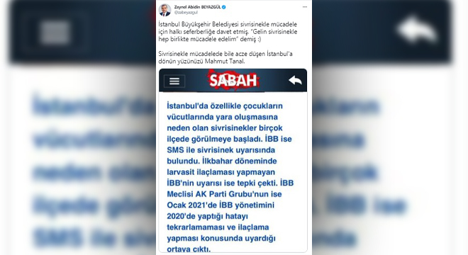 Beyazgül, sosyal medya hesabından “İstanbul Büyükşehir Belediyesi sivrisinekle mücadele için halkı seferberliğe davet etmiş. “Gelin sivrisinekle hep birlikte mücadele edelim” demiş. Sivrisinekle mücadelede bile acze düşen İstanbul'a dönün yüzünüzü Mahmut Tanal” dedi.