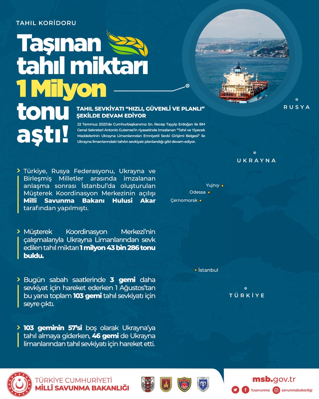 Milli Savunma Bakanlığından (MSB) yapılan açıklamada Ukrayna limanlarından 1 Ağustos'tan itibaren taşınan tahıl miktarının 1 milyon 43 bin 286 ton olduğu duyuruldu.