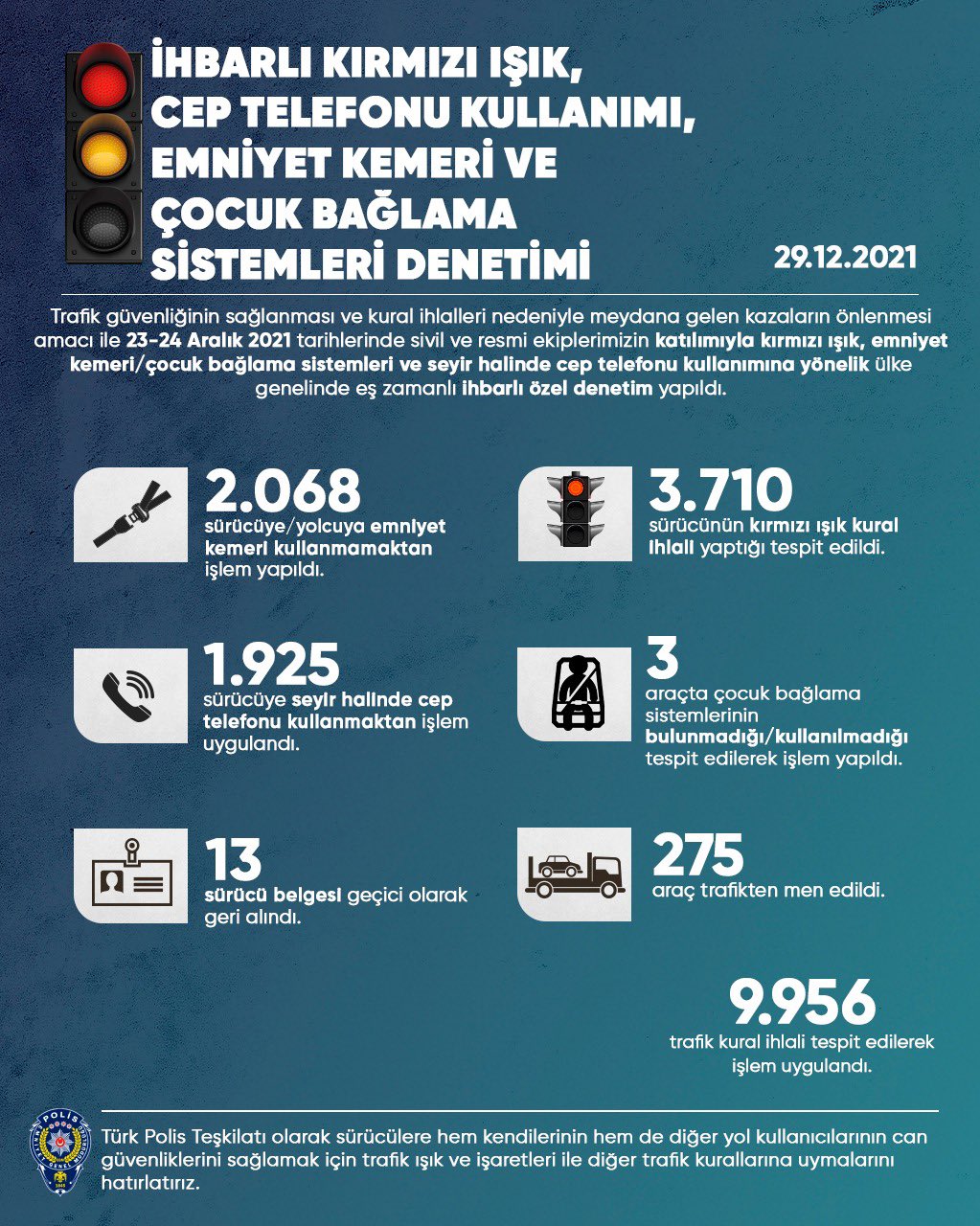 Emniyet Genel Müdürlüğünden yapılan yazılı açıklamaya göre, trafik güvenliğinin sağlanması ve kural ihlalleri nedeniyle meydana gelen kazaların önlenmesi amacıyla 23-24 Aralık'ta sivil ve resmi ekiplerin katılımıyla ülke genelinde eş zamanlı ihbarlı özel denetim yapıldı.