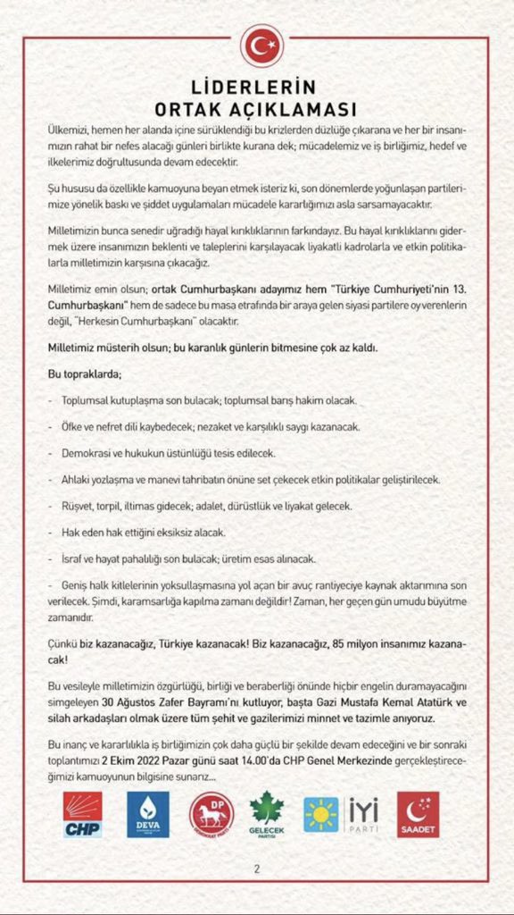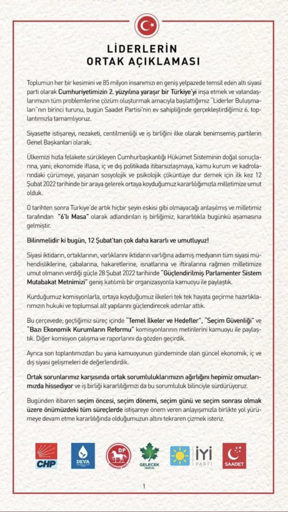 CHP Genel Başkanı Kemal Kılıçdaroğlu, Saadet Partisi Genel Başkanı Temel Karamollaoğlu, İYİ Parti Genel Başkanı Meral Akşener, Demokrat Parti Genel Başkanı Gültekin Uysal, Gelecek Partisi Genel Başkanı Ahmet Davutoğlu ve DEVA Partisi Genel Başkanı Ali Babacan’ın imzasıyla yapılan ortak açıklama şöyle:
