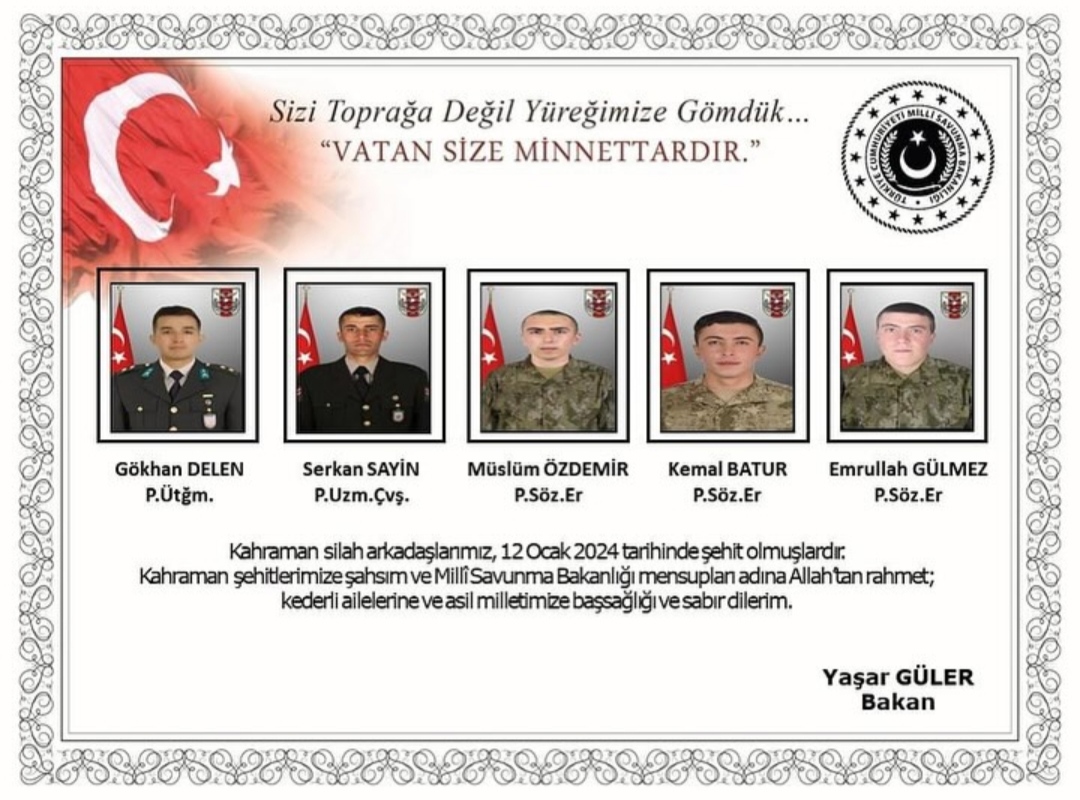 “Pençe-Kilit Harekâtı bölgesinde 12 Ocak 2024 tarihinde bir üs bölgemize sızmaya çalışan teröristlerle çıkan çatışmada dokuz kahraman silah arkadaşımız şehit olmuş, dört kahraman silah arkadaşımız da yaralanmıştır. Yaralılarımız hastaneye sevk edilmiş ve tedavilerine başlanmıştır.