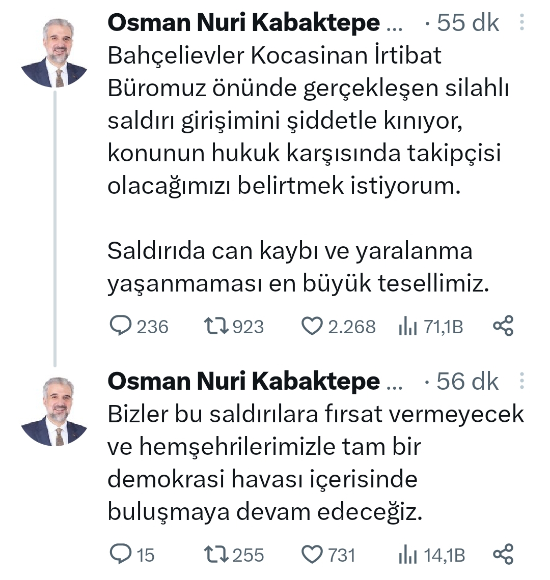 "Bahçelievler Kocasinan İrtibat Büromuz önünde gerçekleşen silahlı saldırı girişimini şiddetle kınıyor, konunun hukuk karşısında takipçisi olacağımızı belirtmek istiyorum. Saldırıda can kaybı ve yaralanma yaşanmaması en büyük tesellimiz.