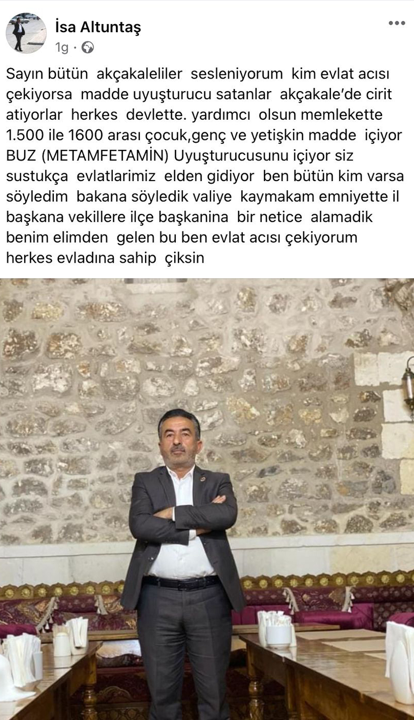 “Uyuşturucu satanlar Akçakale’de cirit atıyorlar” diyen Akçakale Belediyesinin AK Partili Meclis Üyesi İsa Altuntaş, sosyal medya hesabından yaptığı açıklamada “Herkes devlete yardımcı olsun. Memlekette (Akçakale) bin 500 ile bin 600 arası çocuk, genç ve yetişkin madde içiyor. Buz (Metamfetamin) uyuşturucusunu içiyor. Siz sustukça evlatlarımız elden gidiyor. Bakana söyledik… Valiye, kaymakama, emniyete, il başkanına, vekillere ilçe başkanına söyledim. Bir netice alamadık. Benim elimden gelen bu. Ben evlat acısı çekiyorum herkes evladına sahip çıksın” ifadelerine yer verdi.