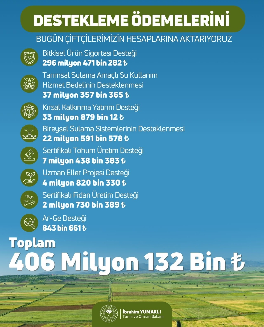 “406 milyon 132 bin TL tarımsal destekleme ödemesini bugün çiftçilerimizin hesaplarına aktarıyoruz. Hayırlı ve bereketli olsun.”