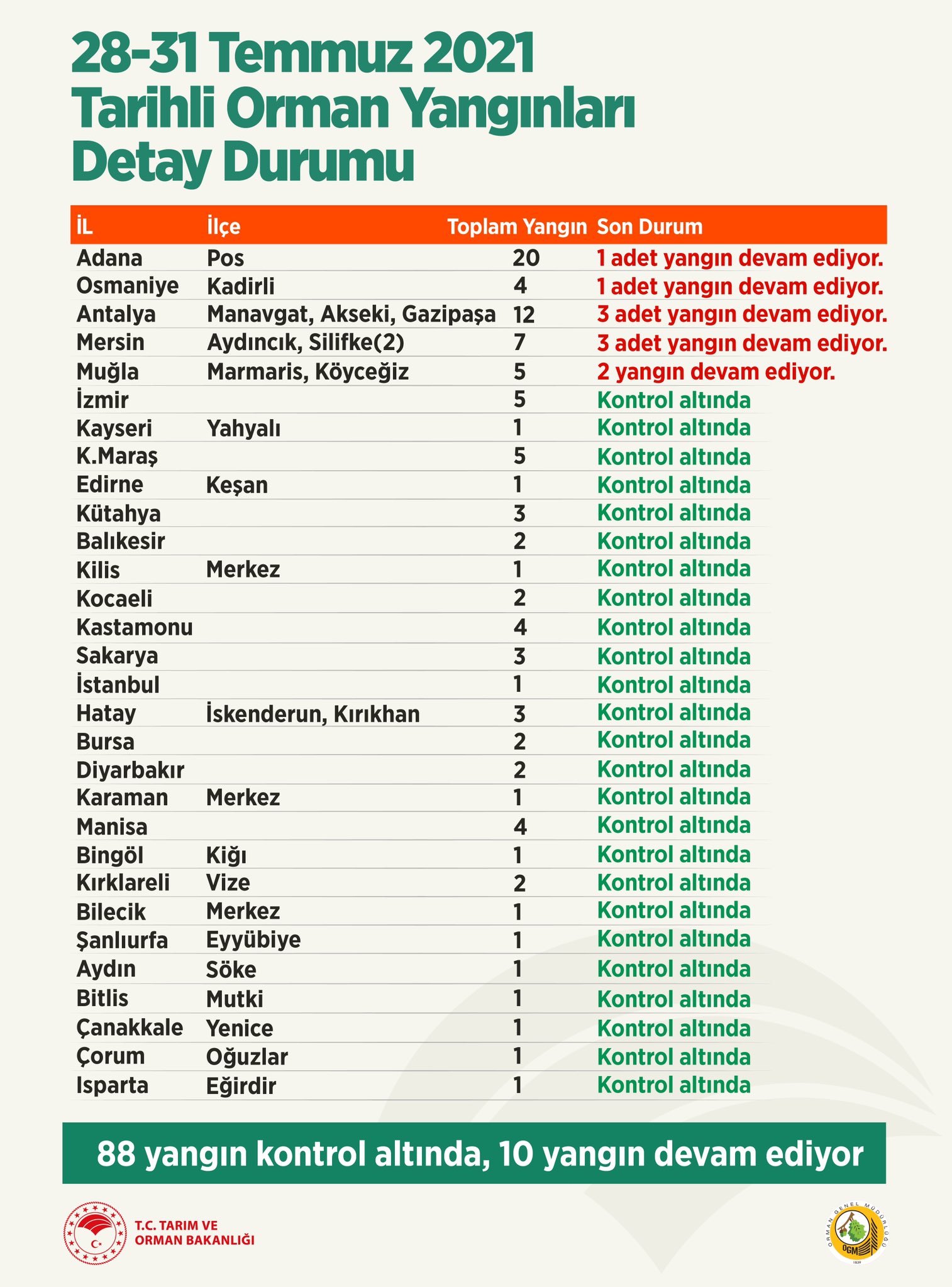 Bakan Pakdemirli sosyal medya hesabından yaptığı paylaşımda, “28-31 Temmuz 2021 tarihleri arasında çıkan 98 orman yangınının 88’ini kontrol altına aldık. 10 yangını kontrol altına alma çalışmaları büyük bir özveri ile devam ediyor” ifadelerine yer verdi.