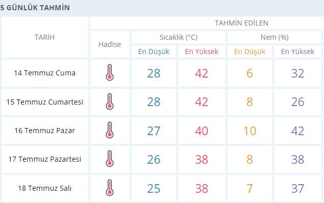 NTV meteoroloji Editörü Dilek Çalışkan, "İstanbul'da sıcaklıklar 37-38 dereceye kadar çıkacak. Çanakkale, Balıkesir, Bursa'da İzmir'de 39, Manisa, Aydın, Denizli hattında 42-43'leri bulacak. Antalya'da 43-44, Adana'da 43 dereceler ölçülecek. Bu dereceleri bekliyoruz. Bunlar gölgedeki sıcaklıklar. Eğer siz güneşteyseniz 55 derece civarı hissedeceksiniz." dedi.