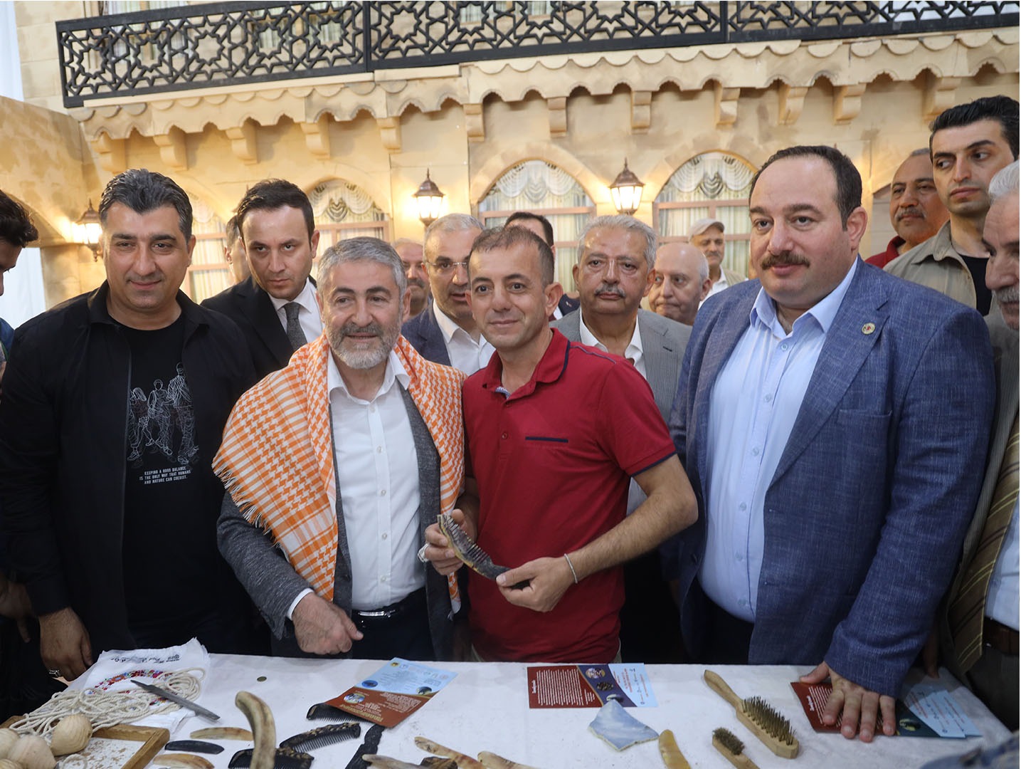 Şanlıurfa Büyükşehir Belediyesi standında bulunan gümüş işleme atölyesi ile boynuzdan yapılan tarakları inceleyen Hazine ve Maliye Bakanı Nureddin Nebati’ye koçboynuzundan tarak ve ateşi kehribar tesbih hediye edildi.