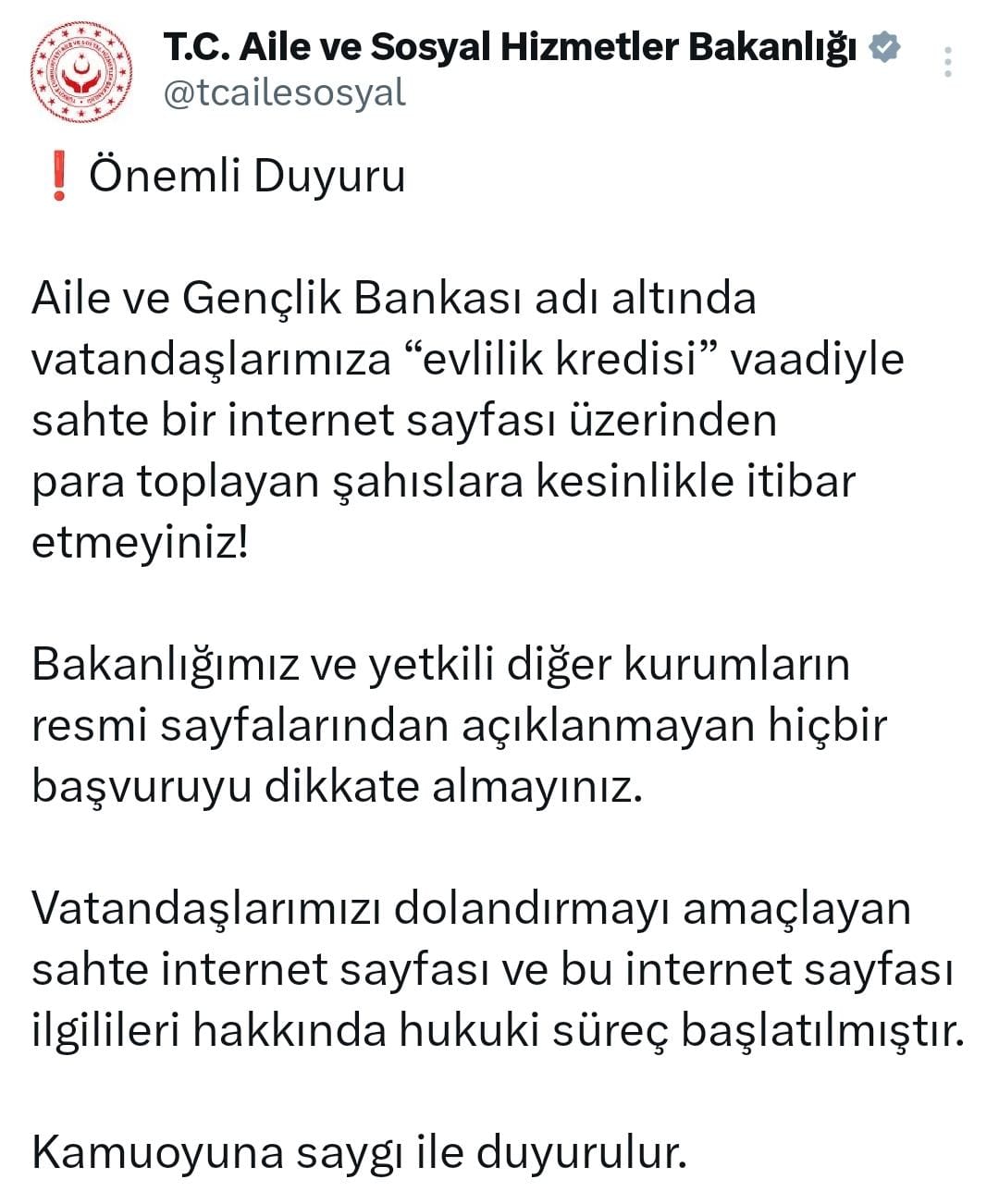 “Aile ve Gençlik Bankası adı altında vatandaşlarımıza “evlilik kredisi” vaadiyle sahte bir internet sayfası üzerinden para toplayan şahıslara kesinlikle itibar etmeyiniz!