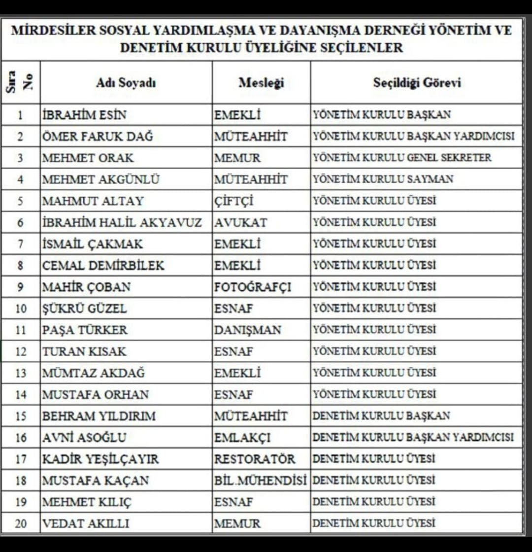 "Mirdesi Aşireti Sosyal Yardımlaşma ve Dayanışma Derneğimiz, temelde akrabalarımız tanışması ve kaynaşması için kurulan bir dernektir. Derneğimiz kurulduğu günden bu yana akrablarına hizmeti şiar edinmiştir.