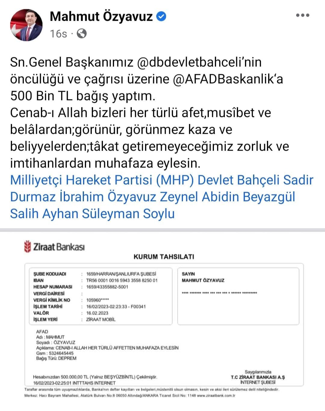 Sosyal medya hesabından açıklama yapan Harran Belediye Başkanı Mahmut Özyavuz ‘Genel Başkanımız Devlet Bahçeli’nin öncülüğü ve çağrısı üzerine AFAD’a 500 bin TL bağış yaptım.
