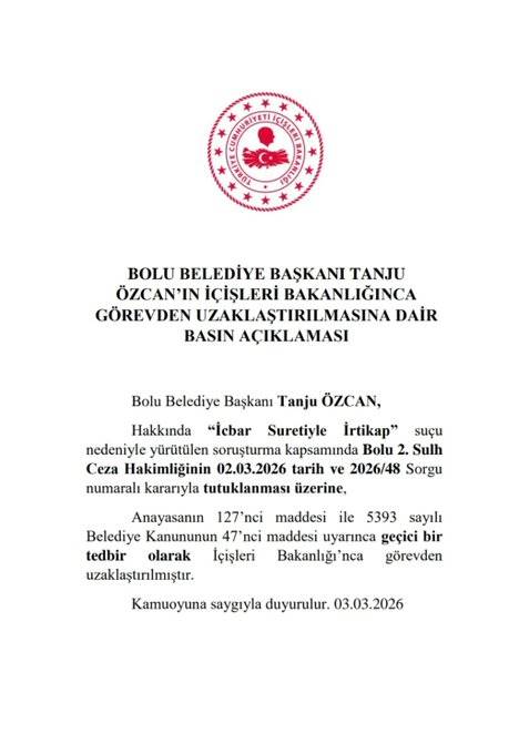 Bakanlık tarafından yapılan yazılı açıklamada, Özcan hakkında “icbar suretiyle irtikap” suçundan yürütülen soruşturma kapsamında Bolu 2. Sulh Ceza Hakimliği’nin 2 Mart 2026 tarihli ve 2026/48 Sorgu sayılı kararıyla tutuklama kararı verildiği belirtildi.Açıklamada, Anayasa’nın 127’nci maddesi ile 5393 sayılı Belediye Kanunu’nun 47’nci maddesi uyarınca, tutuklanmasının ardından Özcan’ın geçici bir tedbir olarak İçişleri Bakanlığı tarafından görevden uzaklaştırıldığı bildirildi.Bakanlık, kararın kamuoyuna saygıyla duyurulduğunu ifade etti.