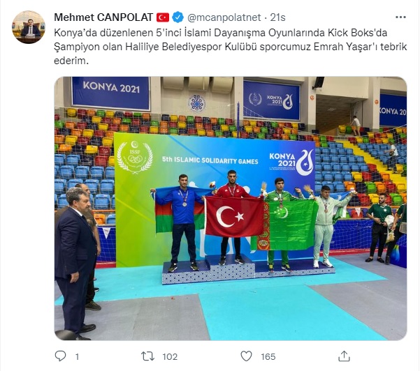 Haliliye Belediye Başkanı Mehmet Canpolat da, altın madalya ile kente dönen sporcuyu tebrik etti. Canpolat, sosyal medya hesabından yaptığı açıklamada, “Konya’da düzenlenen 5'inci İslami Dayanışma Oyunlarında Kick Boks'da Şampiyon olan Haliliye Belediyespor Kulübü sporcumuz Emrah Yaşar'ı tebrik ederim” ifadelerini kullandı.