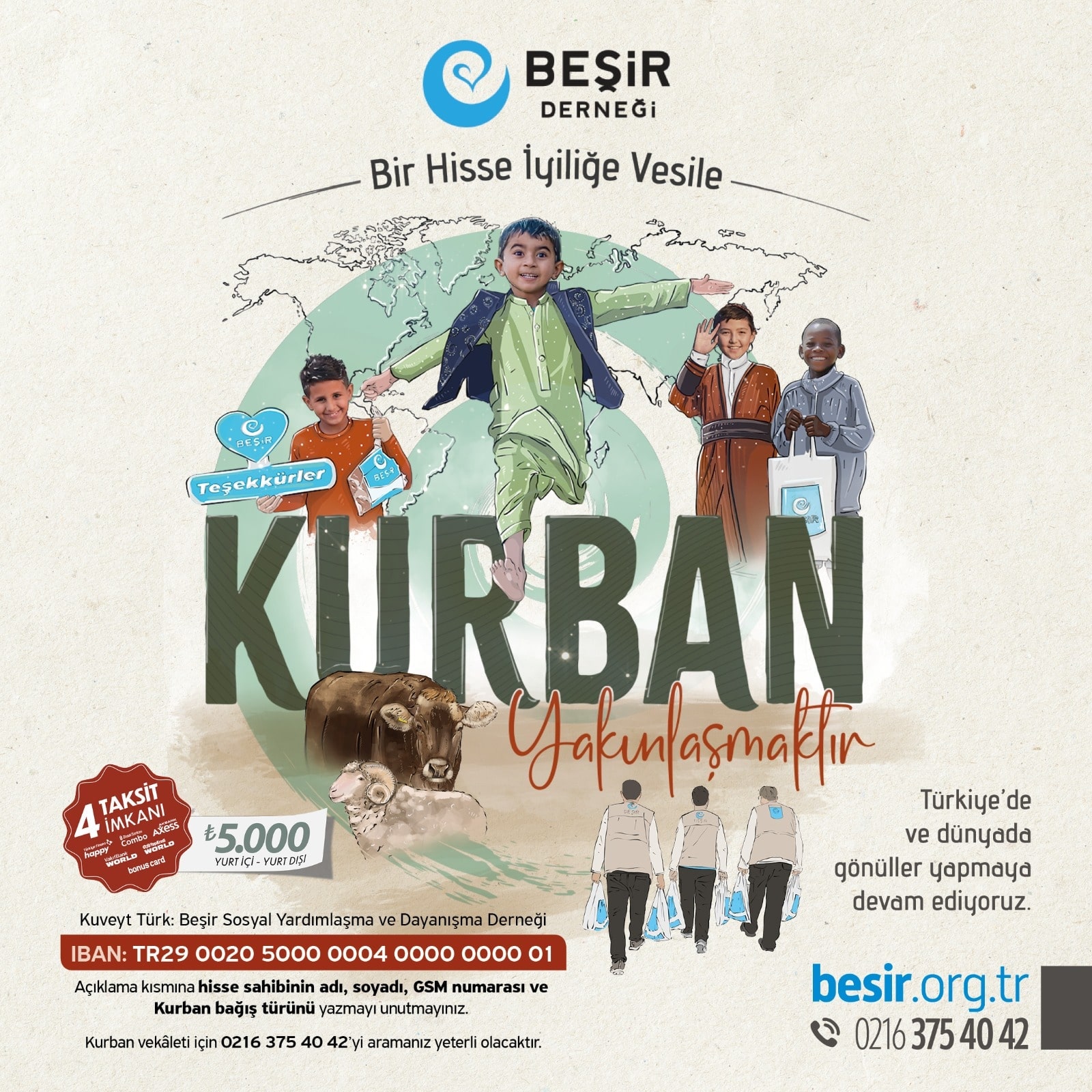 Bağışçılarımız kurban bağışı durumunu web sitemizdeki bağışçı panelimiz üzerinden takip edebilir, kurban türünü, nerede ve ne zaman kesildiğini kolayca öğrenebilir. Kurban bağışlarınızı https://www.besir.org.tr web sitemiz, temsilciliklerimiz, stantlarımız, IBAN numaralarımız, mobil/internet bankacılık şubeniz ve anlaşmalı banka şubelerinde Beşir Derneği ismiyle kolaylıkla yapabilirsiniz” şeklinde konuştu.