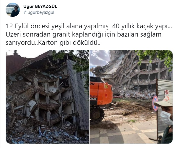 Şanlıurfa Büyükşehir Belediye Başkanı Zeynel Abidin Beyazgül’ün kardeşi Uğur Beyazgül, sosyal medya üzerinden yıkımına başlanan bina için “kaçak yapı” dedi. Beyazgül, “12 Eylül öncesi yeşil alana yapılmış 40 yıllık kaçak yapı” ifadesini kullandı.