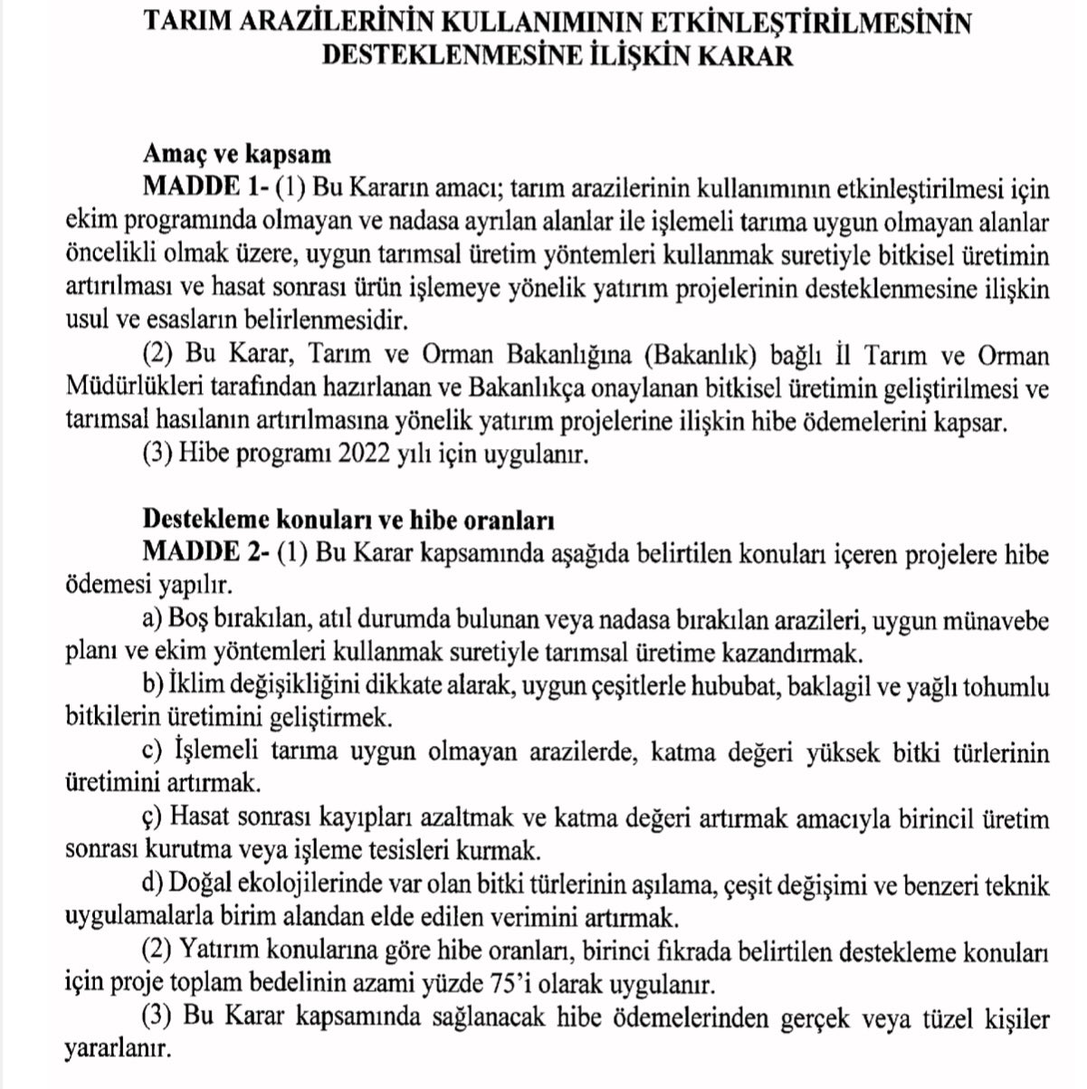 Cumhurbaşkanı Recep Tayyip Erdoğan imzasıyla Resmi Gazete'de yayımlanarak yürürlüğe giren kararla, boş bırakılan, atıl durumda olan veya nadasa bırakılan arazilerde hububat, baklagil ve ayçiçeği, kanola, soya, aspir gibi yağlı tohumlu bitki üretimine hibe desteği verileceği öğrenildi.