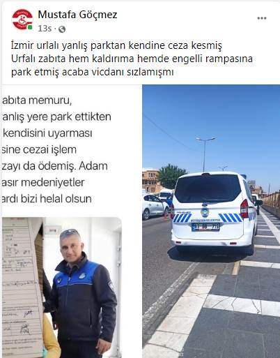 Söz konusu aracın fotoğrafını çeken engelli Mustafa Göçmez, “İzmir Urlalı yanlış parktan kendine ceza kesmiş. Urfalı zabıta hem kaldırıma hem de engelli rampasına park etmiş acaba vicdanı sızlamış mı” diyerek tepkisini dile getirdi.
