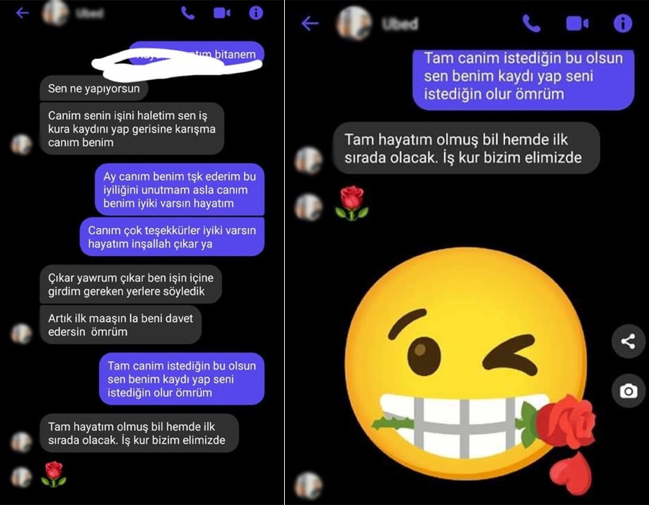 “Canım senin işini hallettim. Sen İŞKUR’a kaydını yap gerisine karışma canım benim” sözleriyle başlayan konuşmanın devamında söz konusu kişi U.U.’ya “Hayatım inşallah çıkar ya” diyor. U.U. ise cevaben, “Çıkar yavrum işin içine ben girdim. Gereken yerlere söyledik” derken ayrıca “Tamam hayatım olmuş bil hem ilk sırada olacak. İŞKUR bizim elimizde” ifadelerini kullanıyor.