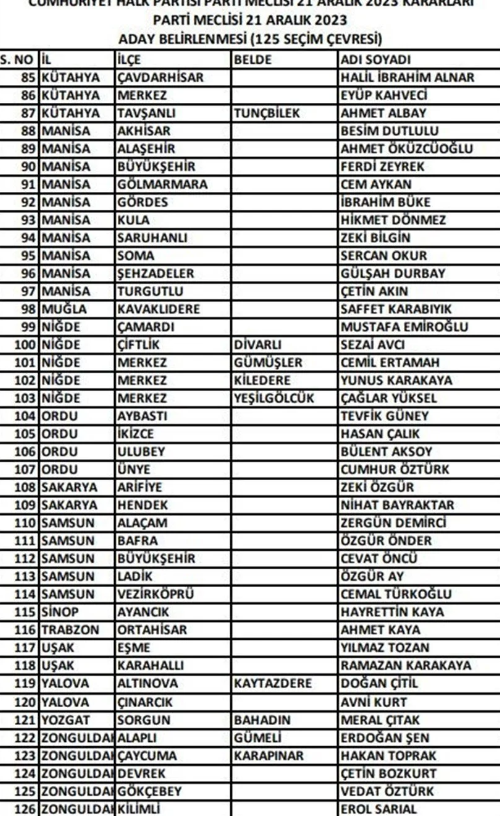 Seçim öncesi adayları merakla beklenen partilerden olan ana muhalefet partisi CHP, 126 belediye başkan adayını daha açıkladı.