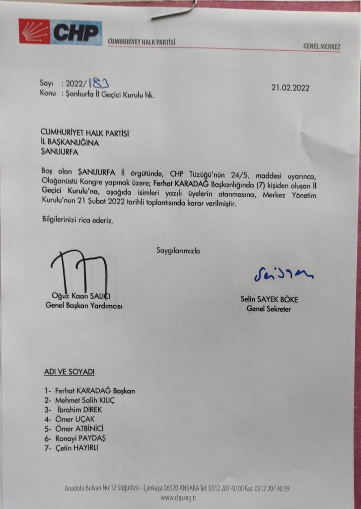 Son 3 gündür kentin gündemini meşgul eden il yönetiminin görevden alınması bugün itibariyle resmileşti. Genel merkez tarafından CHP Şanlıurfa İl Başkanlığına gönderilen yazıda TMMOB Mimarlar Odası Şanlıurfa Şube Başkanı Ferhat Karadağ'ın geçici olarak il başkanlığına atandığı belirtildi.