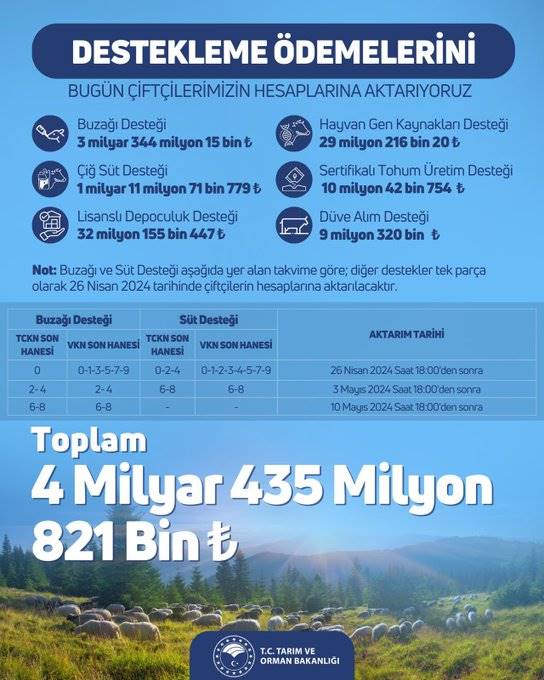 Bakan Yumaklı, “Toplamda 4 milyar 435 milyon 821 bin TL tarımsal destekleme ödemesini çiftçilerimizin hesaplarına aktarıyoruz. Hayırlı ve bereketli olsun.” Dedi.