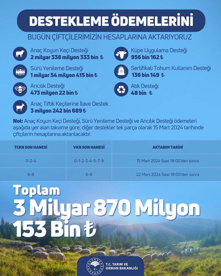 Bakanlıktan yapılan açıklamaya göre, “toplamda 3 milyar 870 milyon 153 bin TL hayvancılık destekleme ödemesi üreticilerin hesaplarına aktarılıyor.” Denildi.