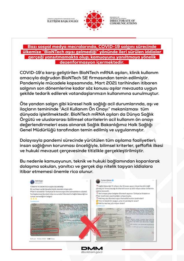 Yapılan yazılı açıklamada, COVID-19’a karşı geliştirilen BioNTech mRNA aşılarının klinik kullanım amacıyla doğrudan BioNTech SE firmasından temin edildiği belirtildi. Açıklamaya göre, Mart 2021’den itibaren salgının son dönemlerine kadar bu aşılar mevzuata uygun şekilde tedarik edilerek vatandaşların kullanımına sunuldu.Bakanlık ayrıca, salgın gibi küresel halk sağlığı acil durumlarında aşı ve ilaç temininde “Acil Kullanım Ön Onayı” mekanizmasının tüm dünyada uygulandığını hatırlattı. BioNTech mRNA aşılarının da Dünya Sağlık Örgütü ve uluslararası bilimsel otoritelerin acil kullanım değerlendirmeleri esas alınarak Sağlık Bakanlığı Halk Sağlığı Genel Müdürlüğü tarafından temin edilip uygulandığı kaydedildi.Açıklamada, pandemi sürecinde yürütülen tüm aşılama faaliyetlerinin insan sağlığının korunması önceliğiyle, bilimsel kriterler, şeffaflık ilkesi ve yürürlükteki hukuki mevzuat çerçevesinde titizlikle gerçekleştirildiği ifade edildi.Sağlık Bakanlığı, kamuoyunun teknik ve hukuki bağlamından koparılarak dolaşıma sokulan yanıltıcı ve gerçek dışı iddialara itibar etmemesi çağrısında bulundu.
