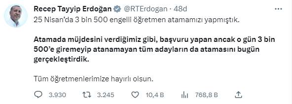 Cumhurbaşkanı Erdoğan, sosyal medya hesabı üzerinden yapmış olduğu açıklamada, “25 Nisan’da 3 bin 500 engelli öğretmen atamamızı yapmıştık. Atamada müjdesini verdiğimiz gibi, başvuru yapan ancak o gün 3 bin 500’e giremeyip atanamayan tüm adayların da atamasını bugün gerçekleştirdik. Tüm öğretmenlerimize hayırlı olsun.” İfadelerini kullandı.