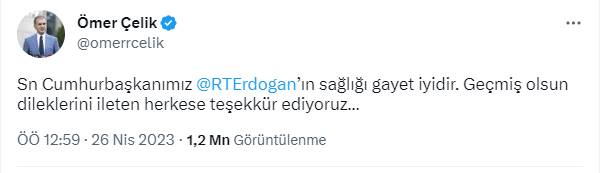 AK Parti Genel Başkan Yardımcısı ve Parti Sözcüsü Ömer Çelik, sosyal medya hesabı üzerinden yaptığı açıklamada, "Sayın Cumhurbaşkanımız Recep Tayyip Erdoğan'ın sağlığı gayet iyidir. Geçmiş olsun dileklerini ileten herkese teşekkür ediyoruz." ifadesini kullandı.