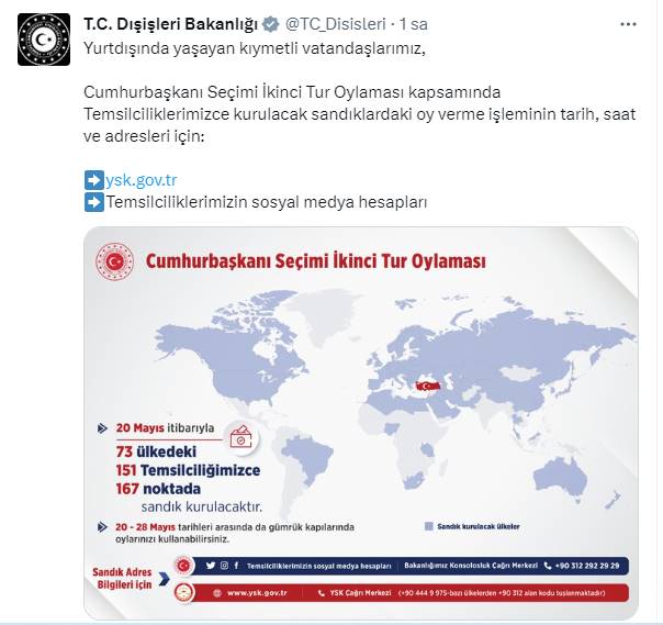 Bakanlık tarafından yapılan açıklamada şu ifadeler yer aldı: ‘’Yurtdışında yaşayan kıymetli vatandaşlarımız, Cumhurbaşkanı Seçimi İkinci Tur Oylaması kapsamında Temsilciliklerimizce kurulacak sandıklardaki oy verme işleminin tarih, saat ve adresleri için: https://ysk.gov.tr Temsilciliklerimizin sosyal medya hesapları’’