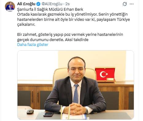Eroğlu açıklamasında, “Ortada kasılarak gezmekle bu iş yönetilmiyor. Senin yönettiğin hastanelerden birine ait öyle bir video var ki, paylaşsam Türkiye çalkalanır,” sözleriyle Sağlık Müdürü Berk’i eleştirdi.İl Sağlık Müdürü’nün hastanelerin mevcut durumunu denetlemek yerine “gösteriş peşinde olduğunu” savunan Erdoğlu, uyarı niteliğinde bir çağrı yaparak şunları söyledi:“Bir zahmet, gösteriş yapıp poz vermek yerine hastanelerinin gerçek durumunu denetle. Aksi takdirde bu görüntüleri paylaşmak zorunda kalacağız.”Söz konusu videonun içeriğine dair detay verilmezken, Erdoğlu’nun çıkışı kentte sağlık yönetimine ilişkin tartışmaları yeniden alevlendirdi.