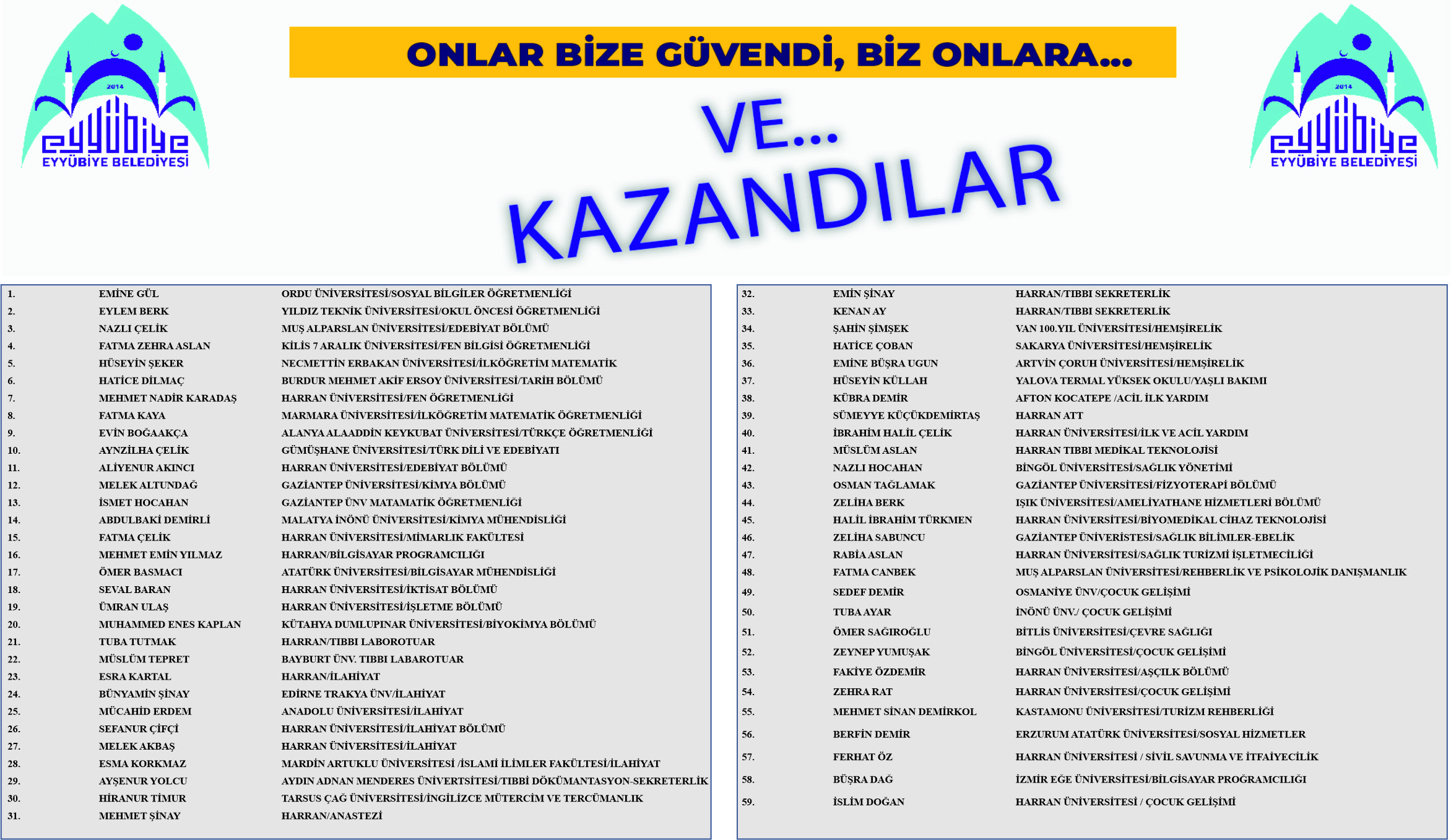 Gençlere, çocuklara, engellilere, kadınlara ve yaşlılara yönelik hizmetlerde pozitif ayrımcılık uygulayan Eyyübiye Belediyesi’nin destekleriyle üniversite hayallerine ulaşan öğrenciler ve kazandıkları bölümler şöyle: