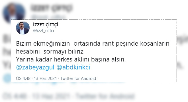 Canlı Hayvan Pazarı Derneği Başkanı İzzet Çiftçi de, iddiaların ardından dikkat çeken bir tweet attı. Çiftçi, sosyal medya hesabından dün yaptığı açıklamada “Bizim ekmeğimizin ortasında rant peşinde koşanların hesabını sormayı biliriz. Yarına kadar herkes aklını başına alsın” ifadelerine yer verdi.