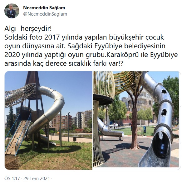 İki parktan fotoğrafları “Algı her şeydir” notuyla paylaşan Sağlam, şu ifadelere yer verdi: “Soldaki foto 2017 yılında yapılan büyükşehir çocuk oyun dünyasına ait. Sağdaki Eyyübiye belediyesinin 2020 yılında yaptığı oyun grubu. Karaköprü ile Eyyübiye arasında kaç derece sıcaklık farkı var?”