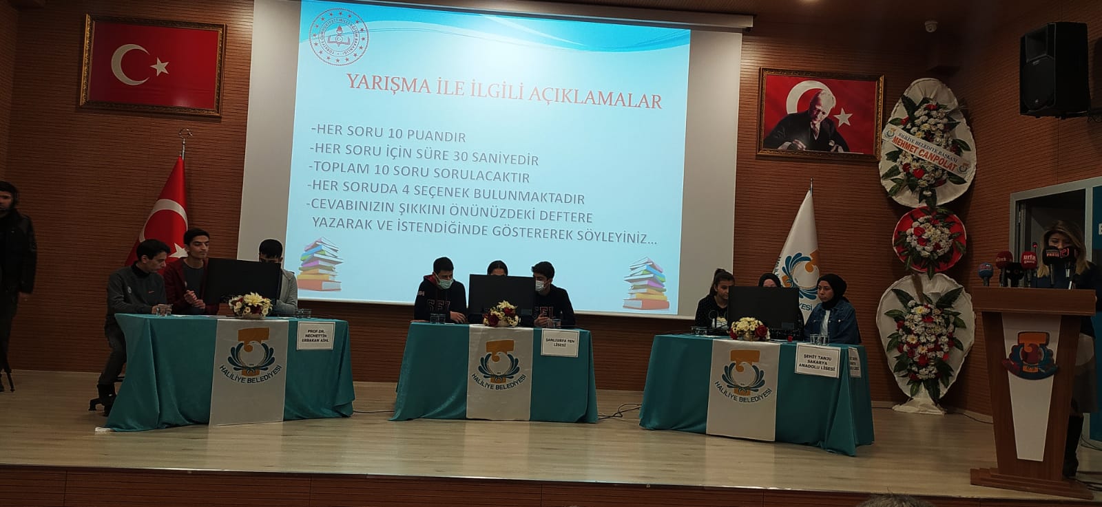 Haliliye Belediyesi ve İlçe Milli Eğitim Müdürlüğünün ortaklığıyla düzenlen “İstiklal Marşı ve Mehmet Akif Ersoy” konulu liseler arası bilgi yarışması finali yapıldı. Haliliye Belediyesi Recep Tayyip Erdoğan Kültür Merkezi Konferans Salonunda finale kalan Prof. Dr. Necmettin Erbakan İmam Hatip Anadolu Lisesi, Şanlıurfa Fen Lisesi ve Şanlıurfa Tanju Sakarya Anadolu Lisesi yarıştı.