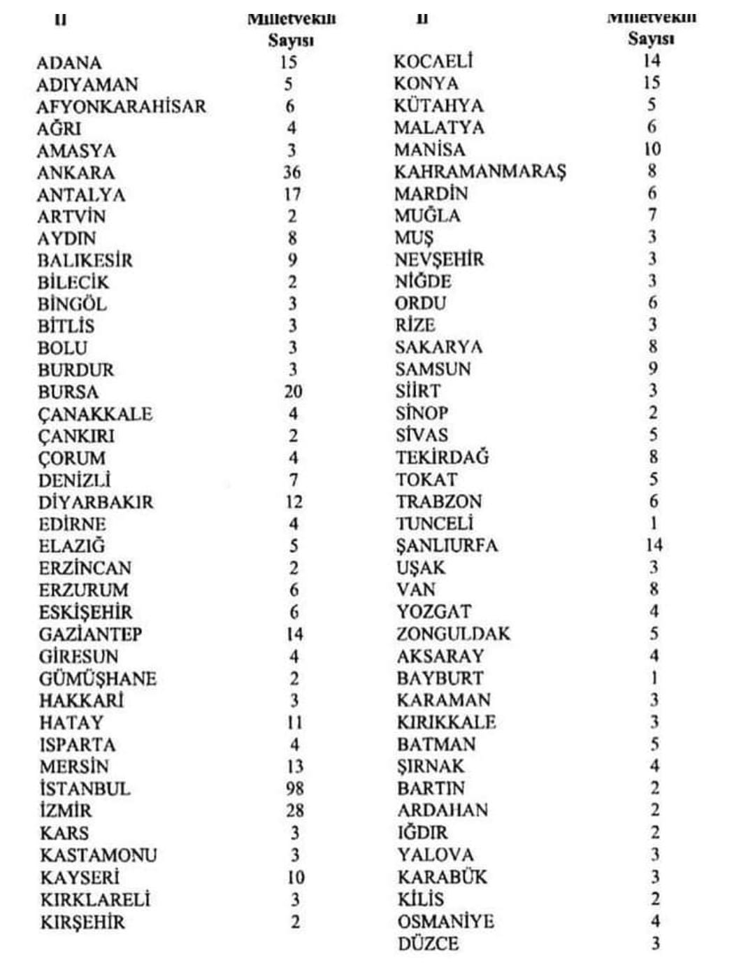 Açıklanan yeni karara göre Türkiye’nin en kalabalık şehirleri olan Ankara 36, İstanbul 98, İzmir 28 milletvekili çıkaracak. Şanlıurfa’nın 14 olan vekil sayısı ise değişmedi.