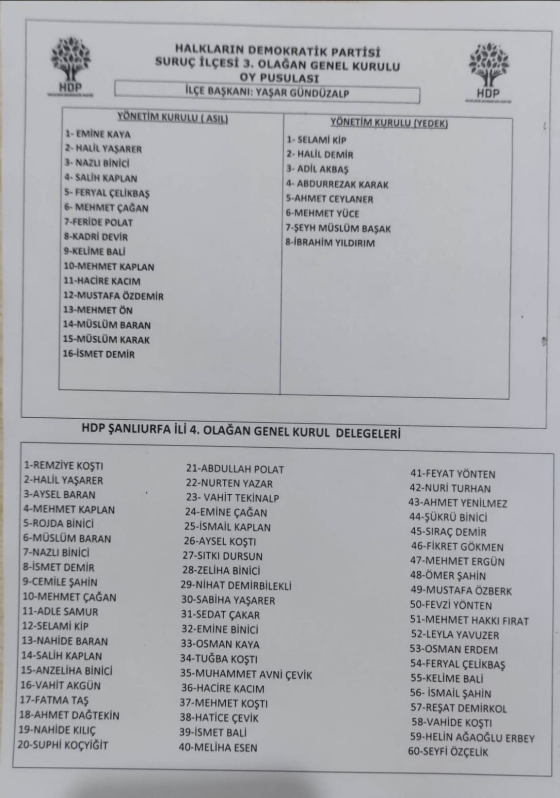 3'ncü olağan kongrenin ardından HDP Suruç İlçe Örgütü'nün yönetim kurulu şu isimlerden oluştu: