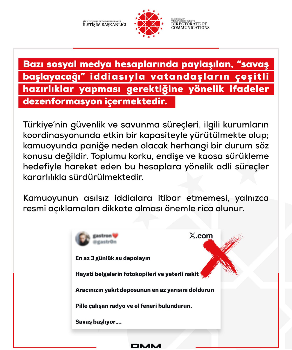 İletişim Başkanlığı, bazı sosyal medya hesaplarında dolaşıma sokulan “savaş başlayacağı” yönündeki iddiaların dezenformasyon içerdiğini açıkladı. Kurum, söz konusu paylaşımlarda vatandaşların çeşitli hazırlıklar yapması gerektiğine dair ifadelerin gerçeği yansıtmadığını bildirdi.Açıklamada, Türkiye’nin güvenlik ve savunma süreçlerinin ilgili kurumların koordinasyonunda, etkin bir kapasiteyle yürütüldüğü vurgulanarak kamuoyunda paniğe yol açacak herhangi bir durumun bulunmadığı ifade edildi.Toplumu korku, endişe ve kaosa sürüklemeyi amaçlayan paylaşımlara karşı adli süreçlerin kararlılıkla sürdürüldüğü belirtilen açıklamada, vatandaşlara asılsız iddialara itibar etmemeleri ve yalnızca resmi açıklamaları dikkate almaları çağrısında bulunuldu.