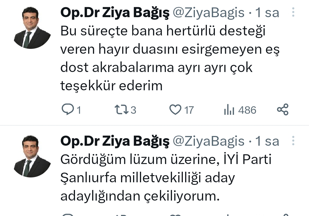 ‘’Gördüğüm lüzum üzerine, İYİ Parti Şanlıurfa milletvekilliği aday adaylığından çekiliyorum.