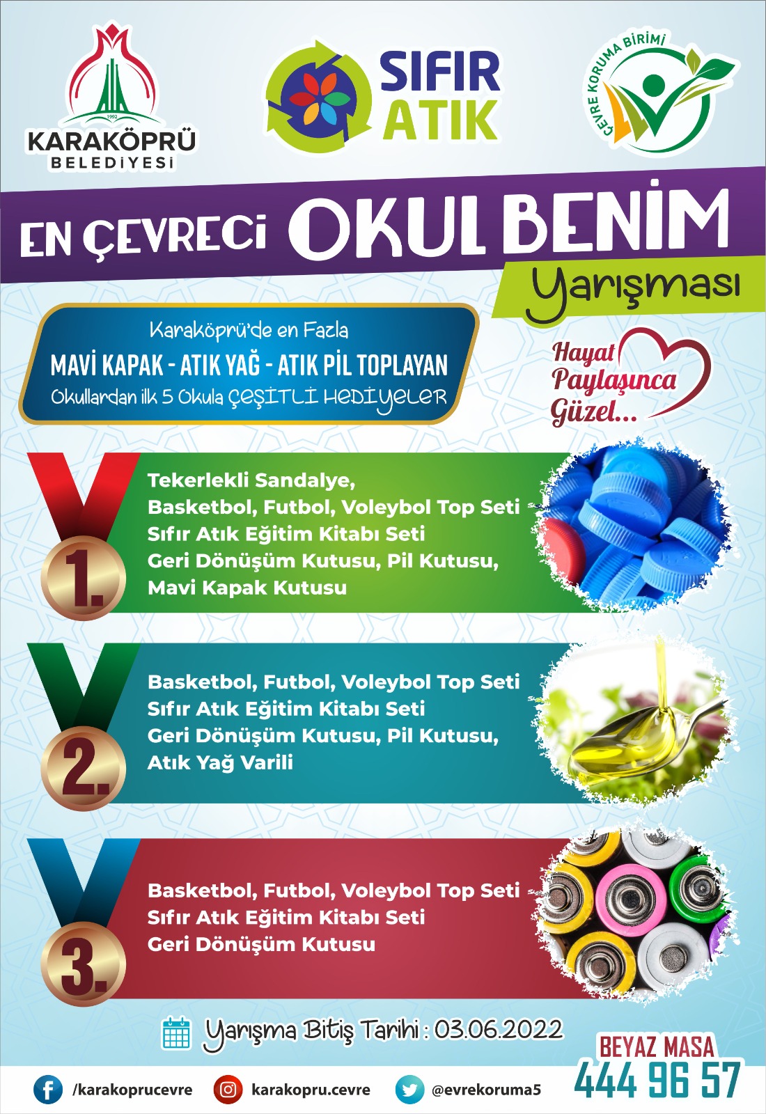 ‘En Çevreci Okul Benim” kampanyasıyla 3 Haziran tarihine kadar en fazla atık pil, mavi kapak ve atık yağ gibi geri dönüştürülebilir atık toplayıp getiren 5 okula çeşitli ödüller verilecek. Bu kampanya ile öğrencilerin geri dönüşüme ilgi göstermeleri ve çevre dostu okullar oluşturulması hedefleniyor.