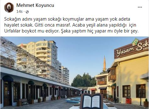 Sosyal medyadan Yaşam Sokağının fotoğraflarını paylaşarak durumu eleştiren Mehmet Koyuncu isimli sosyal medya kullanıcısı, “Sokağın adını yaşam sokağı koymuşlar ama yaşam yok adeta hayalet sokak. Gitti onca masraf. Acaba yeşil alana yapıldığı için Urfalılar boykot mu ediyor. Şaka yaptım hiç yapar mı öyle bir şey.” ifadelerine yer verdi.