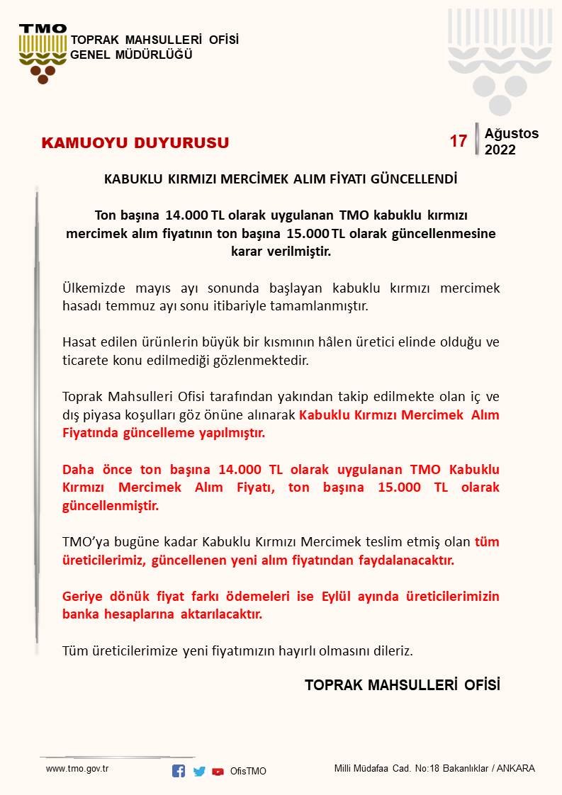 Toprak Mahsulleri Ofisi tarafından yayımlanan duyuruda, üreticinin daha fazla desteklenmesi için kırmızı mercimek alım fiyatında değişikliğe gidildi. Normal piyasada 13-14 TL arası satılan kırmızı mercimek alım fiyatı TMO tarafından 15 TL’ye çıkarıldı.