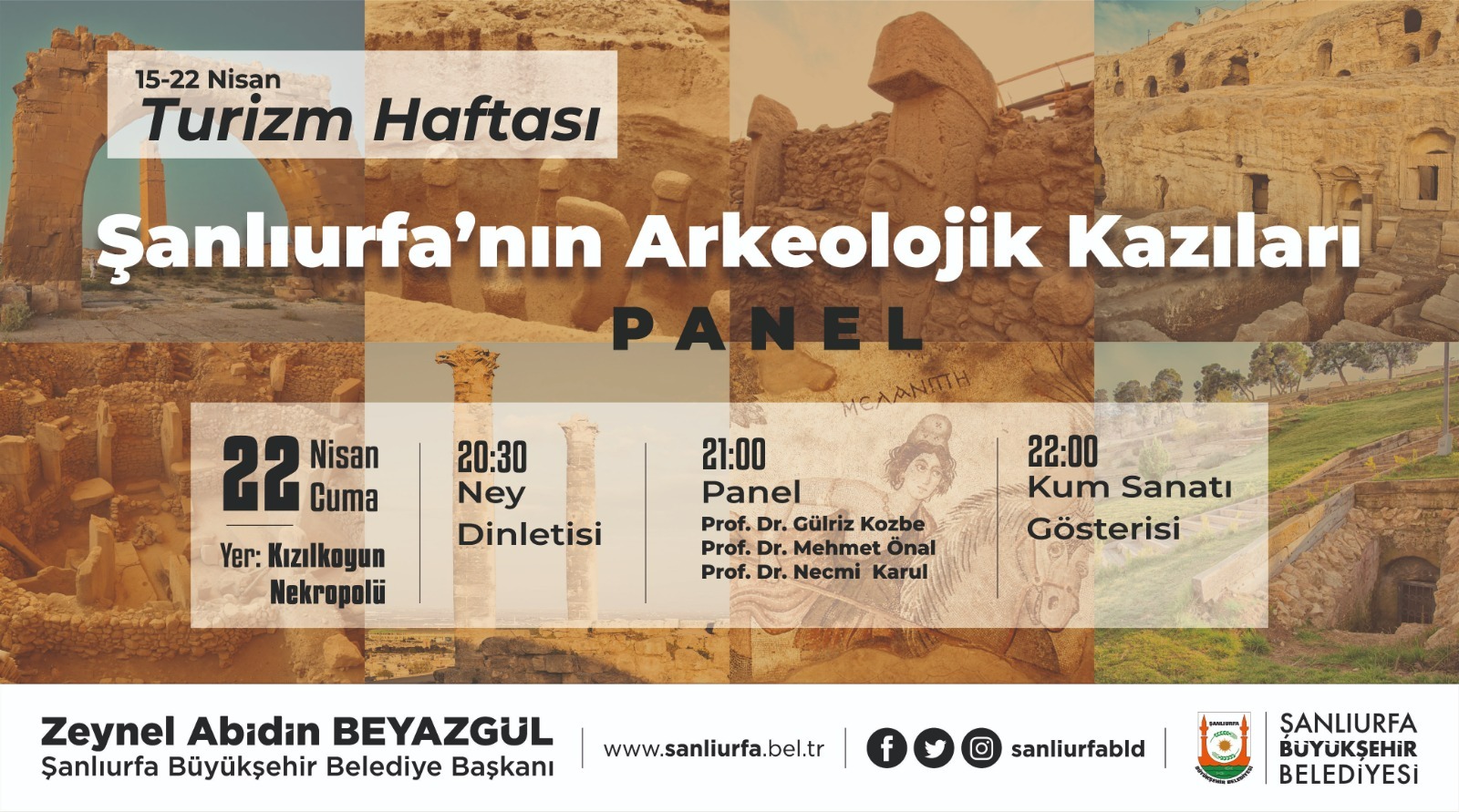 Şanlıurfa Büyükşehir Belediyesi tarafından 15-22 Nisan Turizm Haftası kapsamında Kızılkoyun Nekropolü’nde ney dinletisi ve Şanlıurfa'nın Arkeolojik Kazıları konulu panel düzenlenecek.