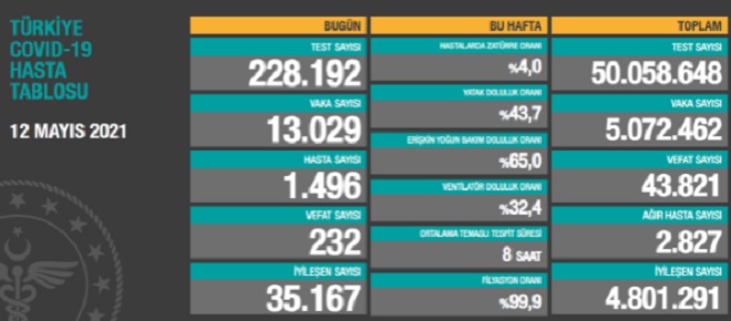 228 bin 192 testte 13 bin 029 kişiye tanı konulmasıyla birlikte toplam vaka sayısı 5 milyon 072 bin 462'ye yükseldi.