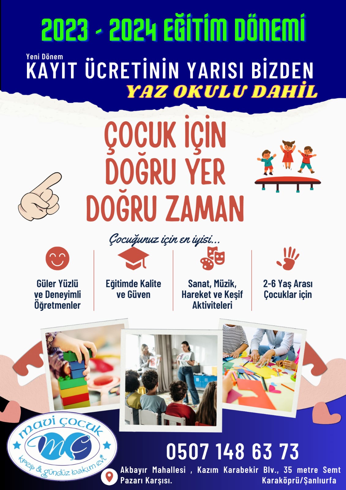 Mavi Çocuk Gündüz Bakım Evi /Anaokulu, Şanlıurfa’da bütün çocukların bu eğitim fırsatından yararlanabilmesi için dev bir kampanya ile yeni sezona girişi yapmaya hazırlanıyor.