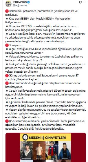 İşçi Sağlığı ve İş Güvenliği (İSİG) Meclisi, Mesleki Eğitim Merkezleri’ne (MESEM) yönelik sert bir açıklama yaparak, uygulamanın “mesleki eğitim adı altında çocuk işçiliğini yaygınlaştırdığını” savundu. Meclis, MESEM’i eleştiren ve çocuk işçiliğine karşı çıkan gençlerin gözaltına alınmasını ve tutuklanmasını da eleştirdi.Açıklamada, hükümet yetkilileri, işverenler, bürokratlar ile yandaş sendika ve medyanın MESEM’i övdüğü belirtilirken, İSİG Meclisi’nin bu modeli “ucuz ve hatta bedava çocuk işçilik programı” olarak değerlendirdiği vurgulandı. Çocuk işçiliğine karşı çıkan ve MESEM’in kapatılmasını talep eden gençlerin gece yarısı evlerinden gözaltına alınmasının kabul edilemez olduğu ifade edildi.İSİG Meclisi, yetkililere şu soruları yöneltti:“MESEM kapsamında eğitim alan, çalışan çocuğunuz ya da torununuz var mı? Yoksa sizin çocuklarınız özel okullarda mı okuyor, hatta yurt dışında mı eğitim alıyor?” Açıklamada, izlenen politikaların toplumda derin bir eşitsizlik yarattığı, “bir kesimin çocuklarının patron ve mevki sahibi olduğu, diğer kesimin çocuklarının ise işçi ve yoksul olmaya mahkûm edildiği” ifade edildi.Meclis, yalnızca bu yılın ilk aylarından itibaren 87 çocuk işçinin hayatını kaybettiğine dikkat çekerek, “Güneş balçıkla sıvanmaz” sözleriyle çocuk işçiliğinin yarattığı ağır tabloya vurgu yaptı.Açıklamada, uzun süredir dile getirilen talepler de yeniden sıralandı. Buna göre; çocuk işçiliğinin tamamen yasaklanması, mesleki eğitimin çocukların gelişimine uygun şekilde ve kamusal kurallar çerçevesinde planlanması istendi. Eğitimin her kademede parasız olması, müfredatın bilimin ışığında ve yaşamla bağ kuran bir anlayışla yeniden yapılandırılması gerektiği belirtildi. Ayrıca çocukların yaşam alanlarının uyuşturucu ve çeteleşmeden arındırılması, spor, sanat ve kültürel etkinliklerle desteklenmesi talep edildi.İSİG Meclisi, açıklamasını “Çocuklarımızın ölmesine, yaralanmasına, zarar görmesine ve uğradıkları baskılara karşı mücadele etmeye devam edeceğiz. Çocuk işçiliği ile mücadele edeceğiz” sözleriyle tamamladı.