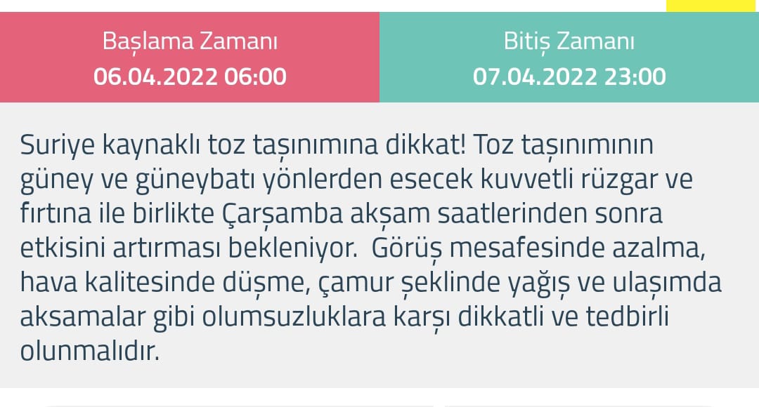 “Suriye kaynaklı toz taşınımına dikkat! Toz taşınımının güney ve güneybatı yönlerden esecek kuvvetli rüzgar ve fırtına ile birlikte Çarşamba akşam saatlerinden sonra etkisini artırması bekleniyor. Görüş mesafesinde azalma, hava kalitesinde düşme, çamur şeklinde yağış ve ulaşımda aksamalar gibi olumsuzluklara karşı dikkatli ve tedbirli olunmalıdır.”