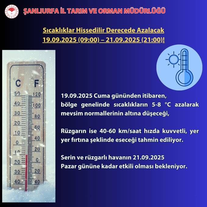Meteorolojik tahminlere göre rüzgarın da etkili olması bekleniyor. Saatte 40-60 kilometre hızla esecek rüzgarın, yer yer fırtına şiddetinde olabileceği bildirildi.Uzmanlar, serin ve rüzgarlı havanın 21 Eylül 2025 Pazar gününe kadar etkili olacağını belirterek, vatandaşları dikkatli olmaları konusunda uyardı. Tarım ve hayvancılıkla uğraşan üreticilerin de bu hava değişikliğine karşı gerekli tedbirleri alması istendi.