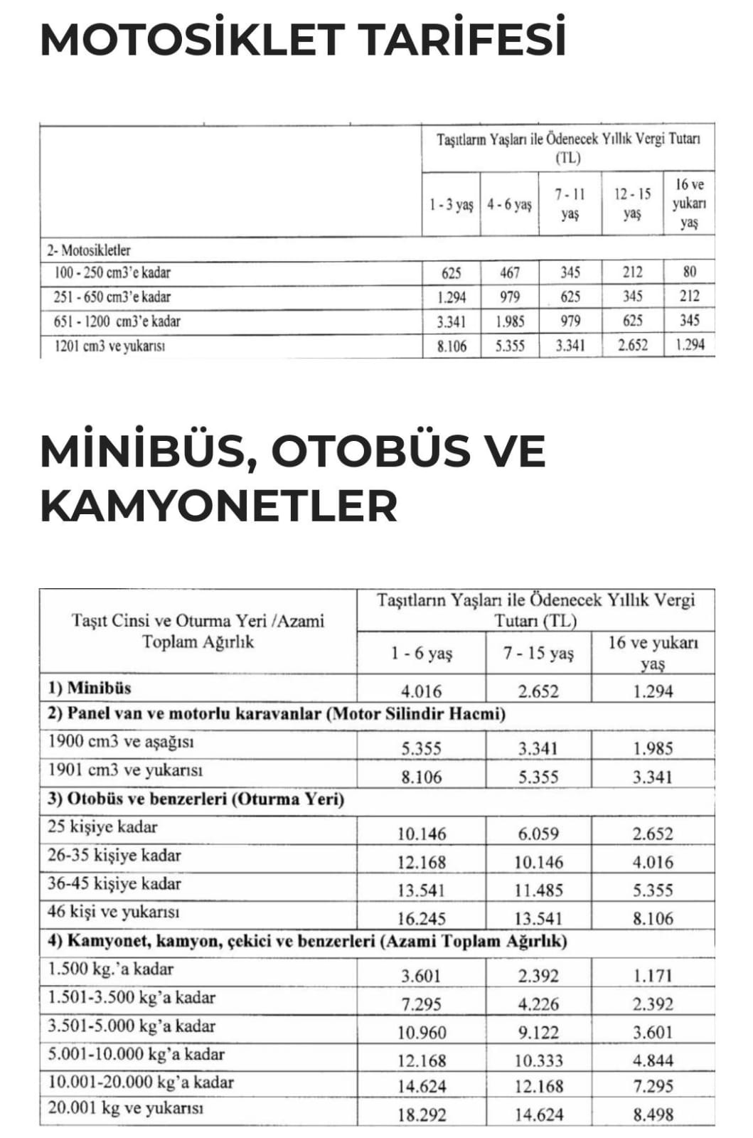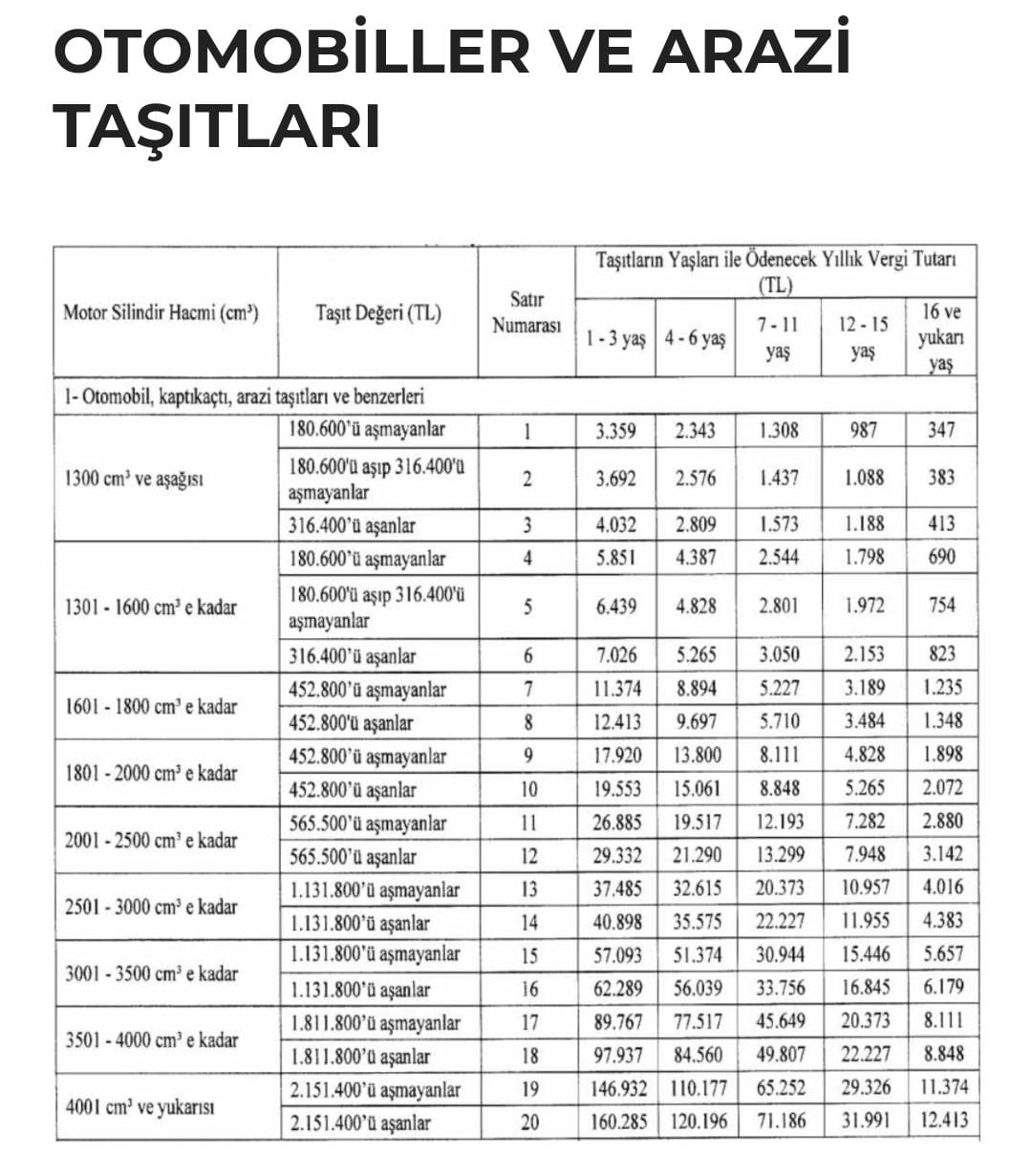 2024 yılı Motorlu Taşıtlar Vergisi tarifesi şöyle: