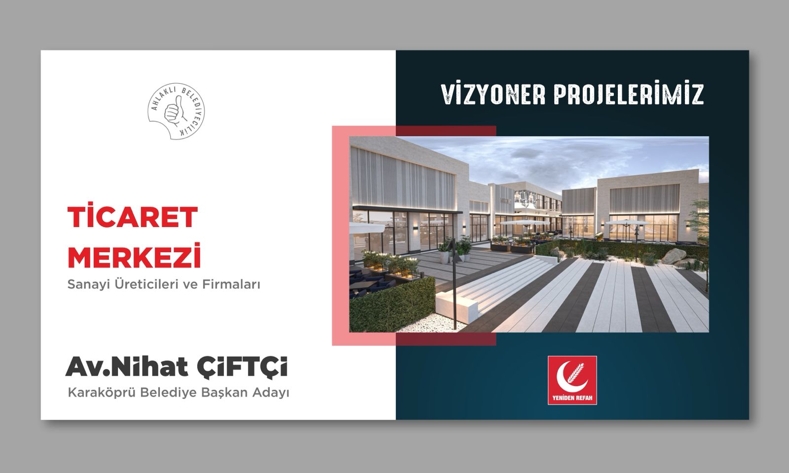 Karaköprü’de büyük bir gelişim ve dönüşümü hayata geçirmeyi hedefleyen Yeniden Refah Partisi Şanlıurfa Karaköprü Belediye Başkan Adayı Av. Nihat Çiftçi, Karaköprü’yü ticaret merkezi yapmak için hazırladığı projelerini açıkladı.